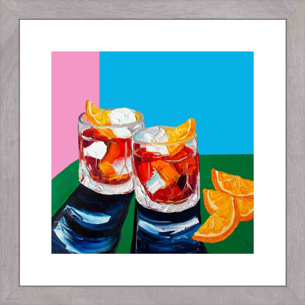 Negronis on pink, blue and green Art Print. Absolutely love this colour combo! Printed on premium quality paper, mounted and in a cellophane sleeve.